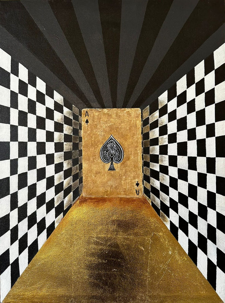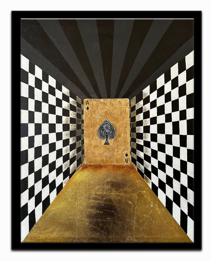 The card, Ace of Spades, is known for its association with power, fate, and mystery. It serves as a focal point and a gateway into the surreal environment in the painting.