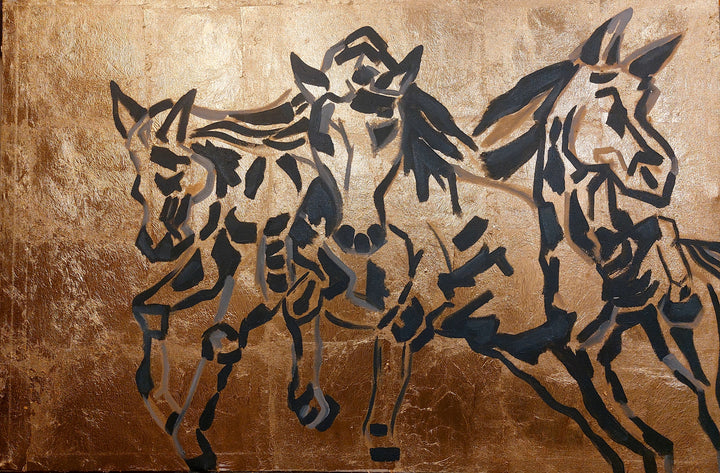 This artwork presents a striking figurative depiction of wild horses, their dynamic silhouettes rendered with precision against a radiant goldleaf background. The interplay of bold forms and luminous gold evokes the raw energy and freedom of untamed nature, making it an exceptional piece for discerning collectors who appreciate both artistic mastery and symbolic depth.