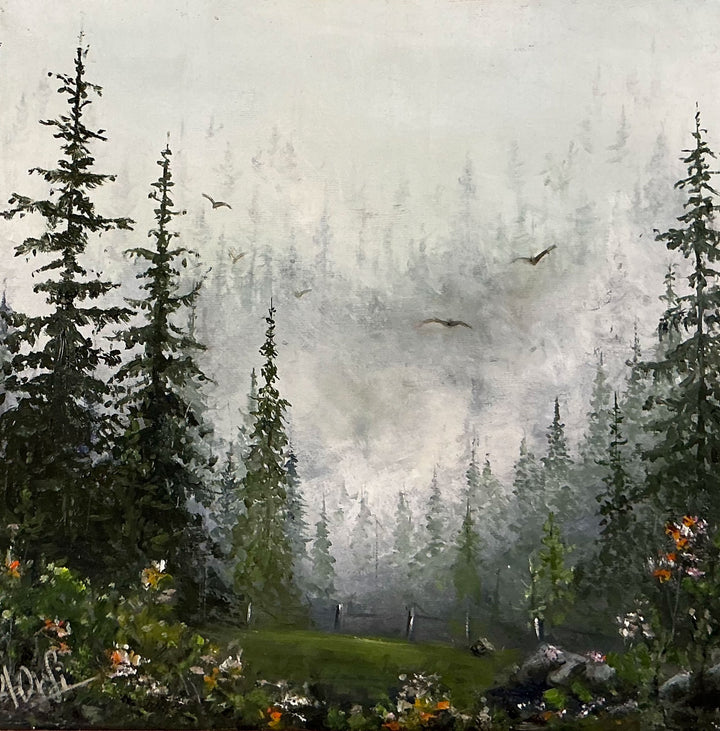Immerse yourself in the serene beauty of "Inner Peace," a scene where lush green valleys meet the gentle embrace of misty weather. Delicate flowers bloom cozy looks framed by trees, creating an atmosphere that soothes and inspires. This harmonious blend evokes calmness and invites quiet reflection, perfect for those seeking a peaceful connection with nature.