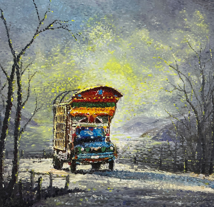 Journey withIn captures the vibrant energy of an abstract, colorful truck navigating a zigzag path lined with yellow leaves. This...