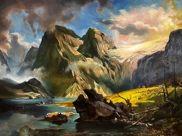 Experience the awe of majestic mountains framed by low-hanging clouds, creating a serene yet powerful landscape. This scene features a solitary boat and a humble hut nestled among weathered stones and fallen trees, evoking a profound sense of solitude and natural beauty. Perfect for those who appreciate rugged wilderness and isolation, this depiction captures the quiet strength of nature in every detail.