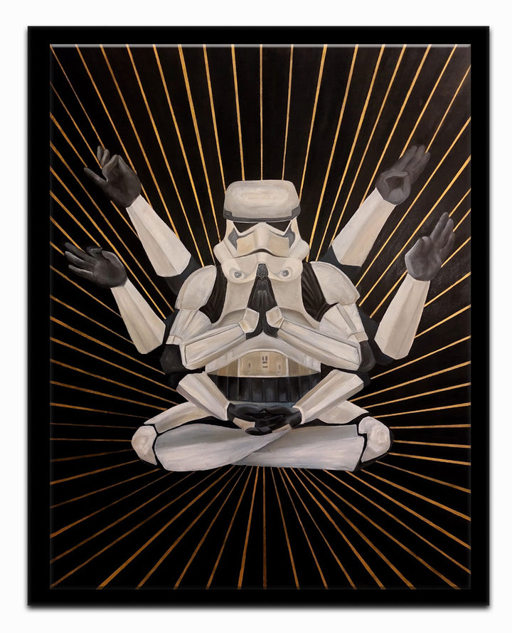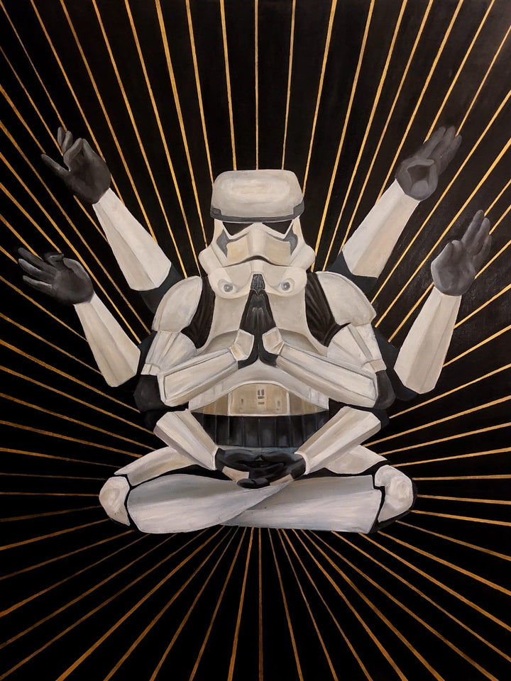 "Galactic Enlightenment" seamlessly blends the realms of science fiction and spirituality. The central figure is a Stormtrooper, a symbol of the "Star Wars" universe, depicted in a meditative pose traditionally associated with divine figures in Eastern religions. This juxtaposition of pop culture iconography with spiritual imagery invites viewers to reflect on the intersections of modern mythology and ancient wisdom.